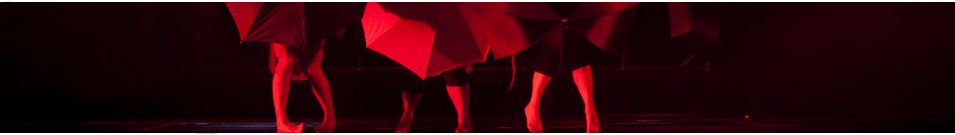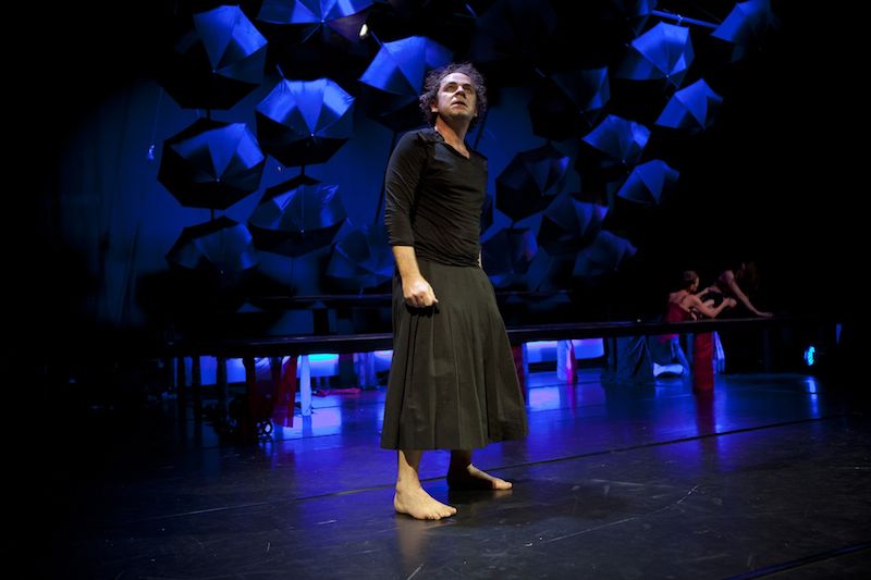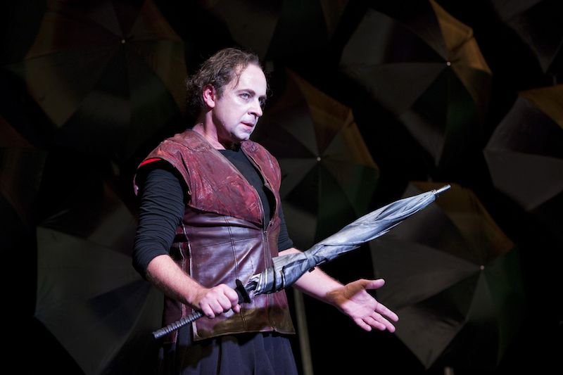 schwarze Regenschirme, die an der Decke hängen und als Bühnenrückwand dienen. Zum Schluss, wenn die Wand langsam umkippt,