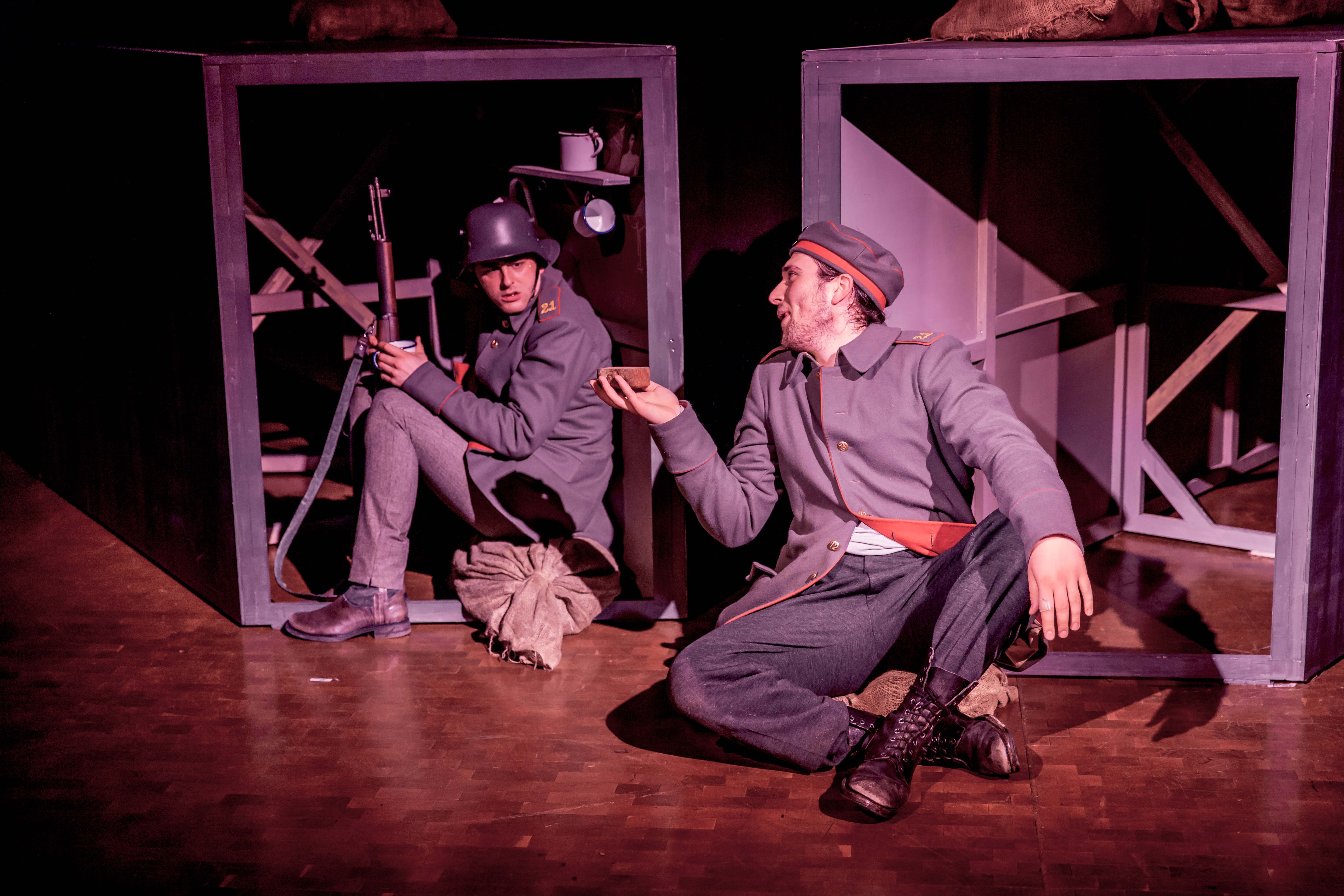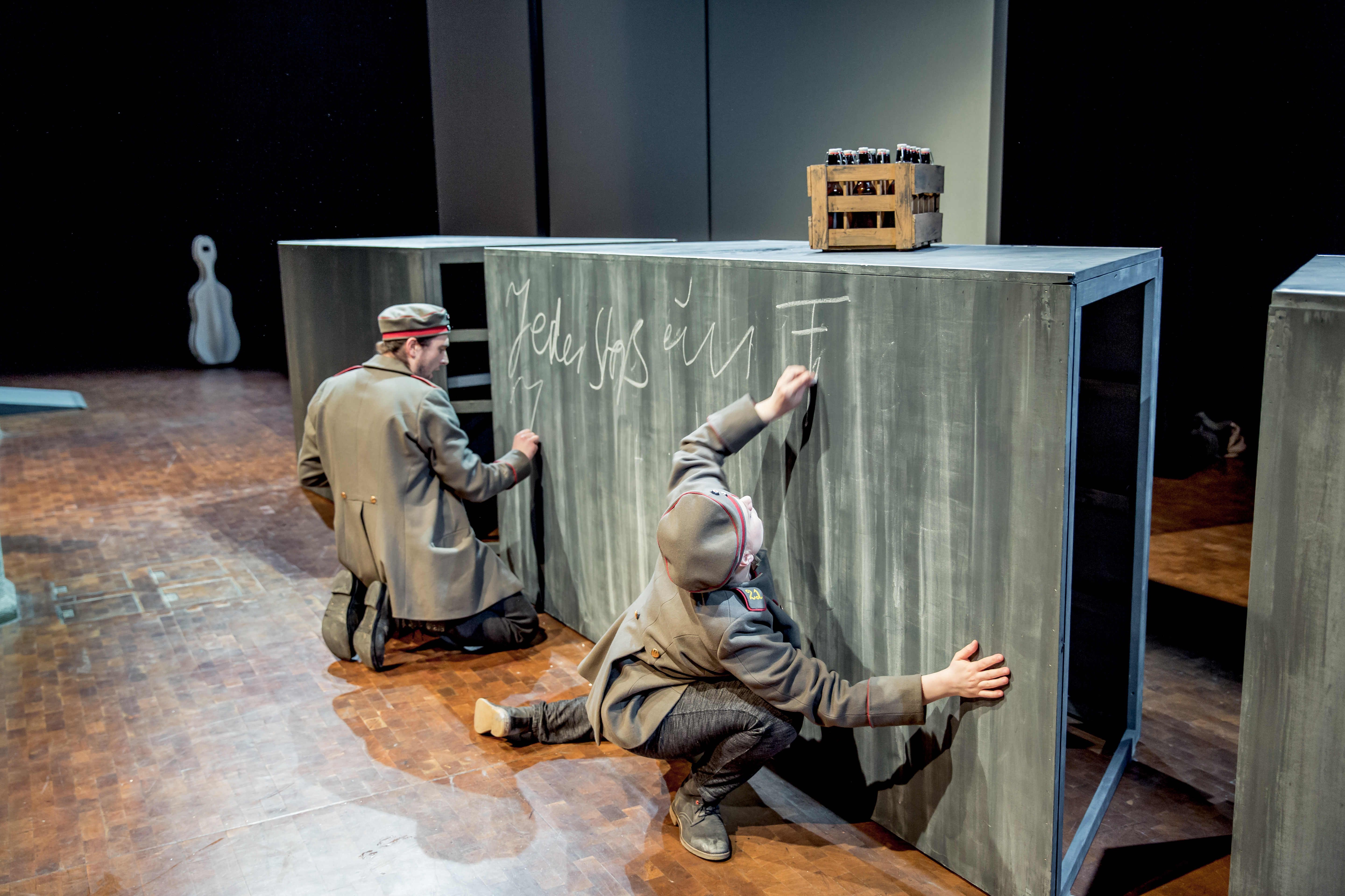 Besonders eindringlich ist der Kriegsschauplatz gestaltet: mit verschiebbaren grauen Podesten erstehen die