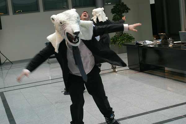 da setzt er sich einen Furcht erregenden Eisbärenkopf auf, zieht Inline-Skater