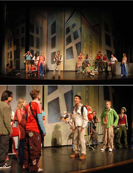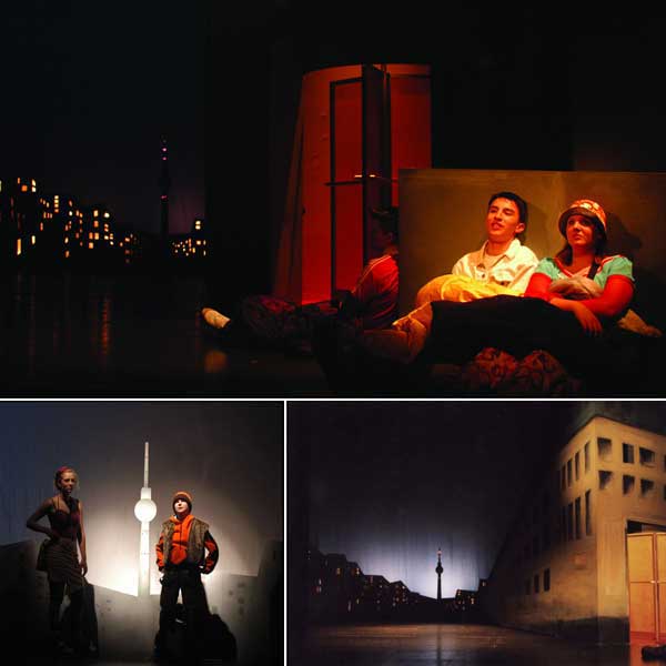 »Zwölf Jugendliche gammeln im Bühnenvordergrund des kleinen Hauses herum. Klamotten und Gehabe sind nicht weniger nah an der Realität als ihre Gespräche über Tatoos und Taschengeld. Nebenbei rasselt die bunte Gang lässig mit Schlüsseln oder klopft und bollert gegen Bühnenelemente. (...) Geschickt spielt die Regie mit den Möglichkeiten des variablen Bühnenbildes. Zimmer-Service etwa bedeutet (...), dass ein Hotelzimmer vor den Augen des Publikums aus vorhandenen Kulissen entsteht und wieder verschwindet. Realismus- wie ein bei Nacht blinkender Berliner Fernsehturm- und Abstraktion halten sich die Waage. Selbst das Problem, Verfolgungsjagden auf eine Theaterbühne zu übertragen, wurde überzeugend gelöst.
