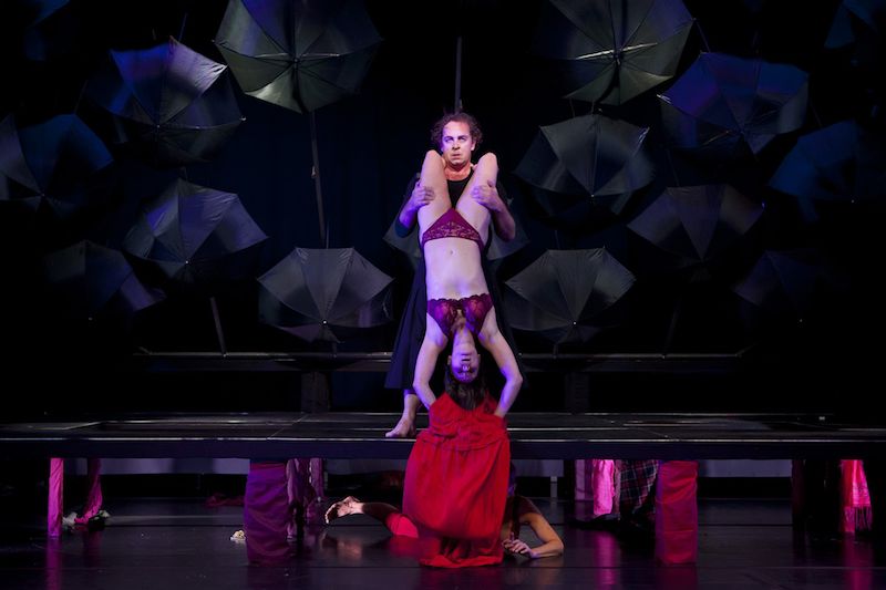schwarze Regenschirme, die an der Decke hängen und als Bühnenrückwand dienen. Zum Schluss, wenn die Wand langsam umkippt,