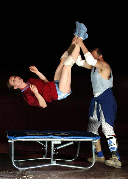Trampolin und der Schauspieler Guido Wachter unter Beschuss von Tennisbällen.